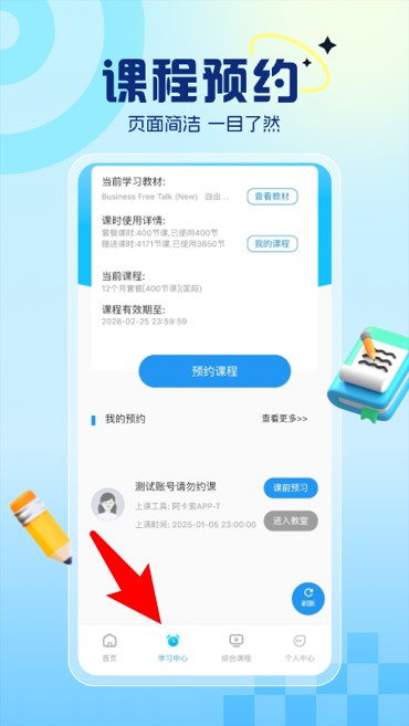 3、点击底部的学习中心查看课程预约,可以快速进入教室或查看当前课程安排。