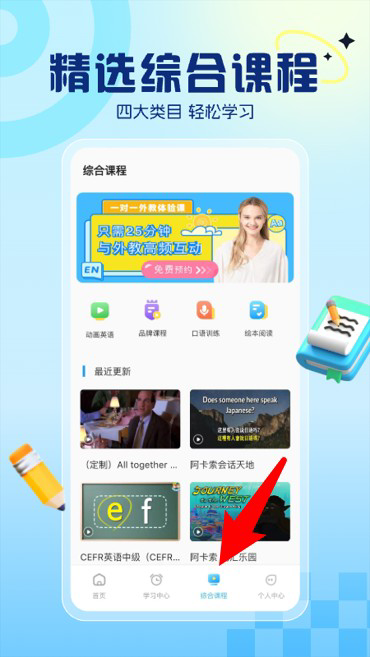4、精选的综合课程分类明确,用户可以根据自己的兴趣选择合适的外教课程进行在线学习。